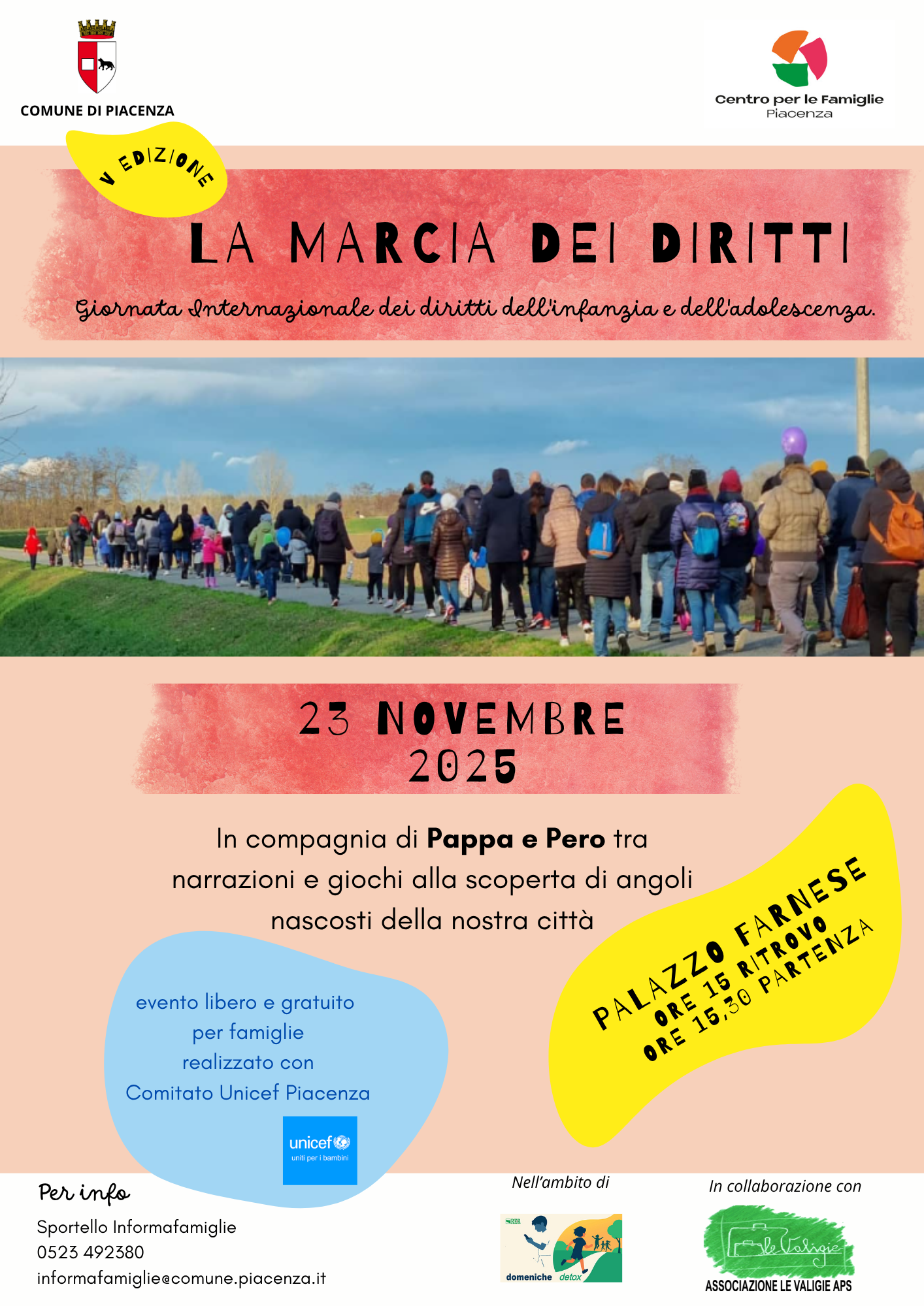Si invitano quindi tutti i cittadini a partecipare domenica 23 alla camminata. Il ritrovo è fissato alle 15 nel cortile di Palazzo Farnese da dove si partirà, alle 15.30, per un itinerario animato rivolto a bambini e accompagnatori adulti tra le vie del centro storico, insieme al Centro per le Famiglie del Comune di Piacenza, all'associazione Le Valigie e al Comitato provinciale Unicef.